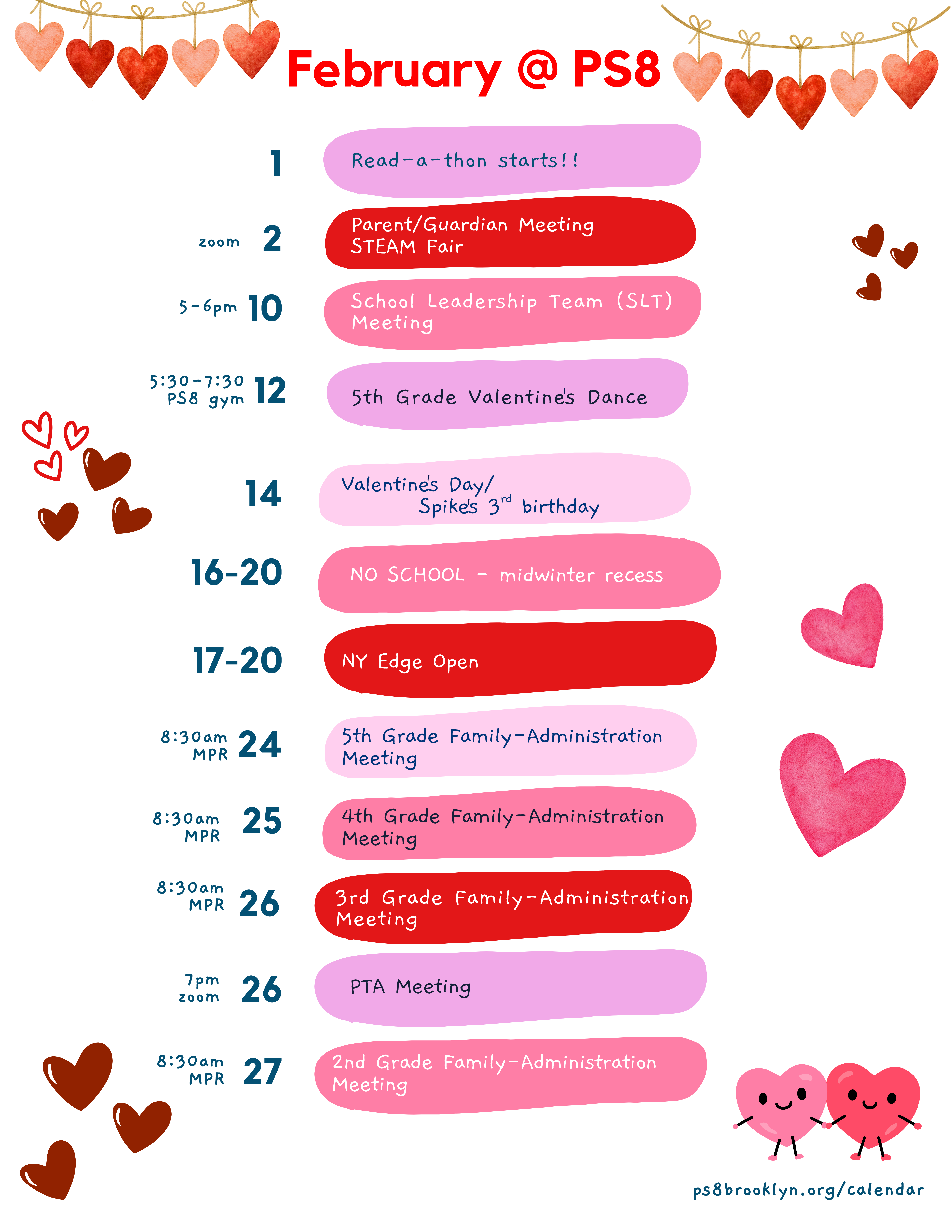 February 26, 2026 7:00 pm - 8:00 pmJoin us on Zoom for the Monthly PTA Meeting! Link will be sent via Mailchimp (subscribe to the PTA list). See the full schedule: ps8brooklyn.org/pta-meetings