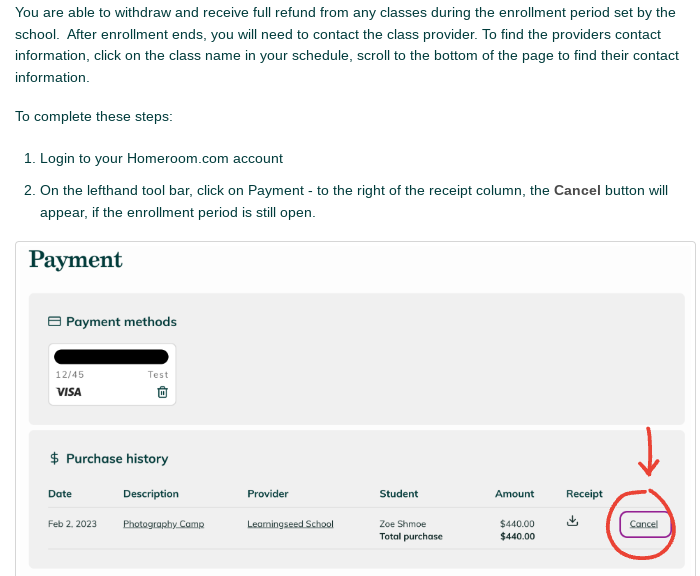 During open enrollment, you may cancel your enrollment directly in Homeroom.com. Once the Enrollment Period is over, for extenuating circumstances only, please reach out to the provider directly. To do so, click on the course name under, Description. Scroll to the bottom of the page to locate the provider’s contact information.